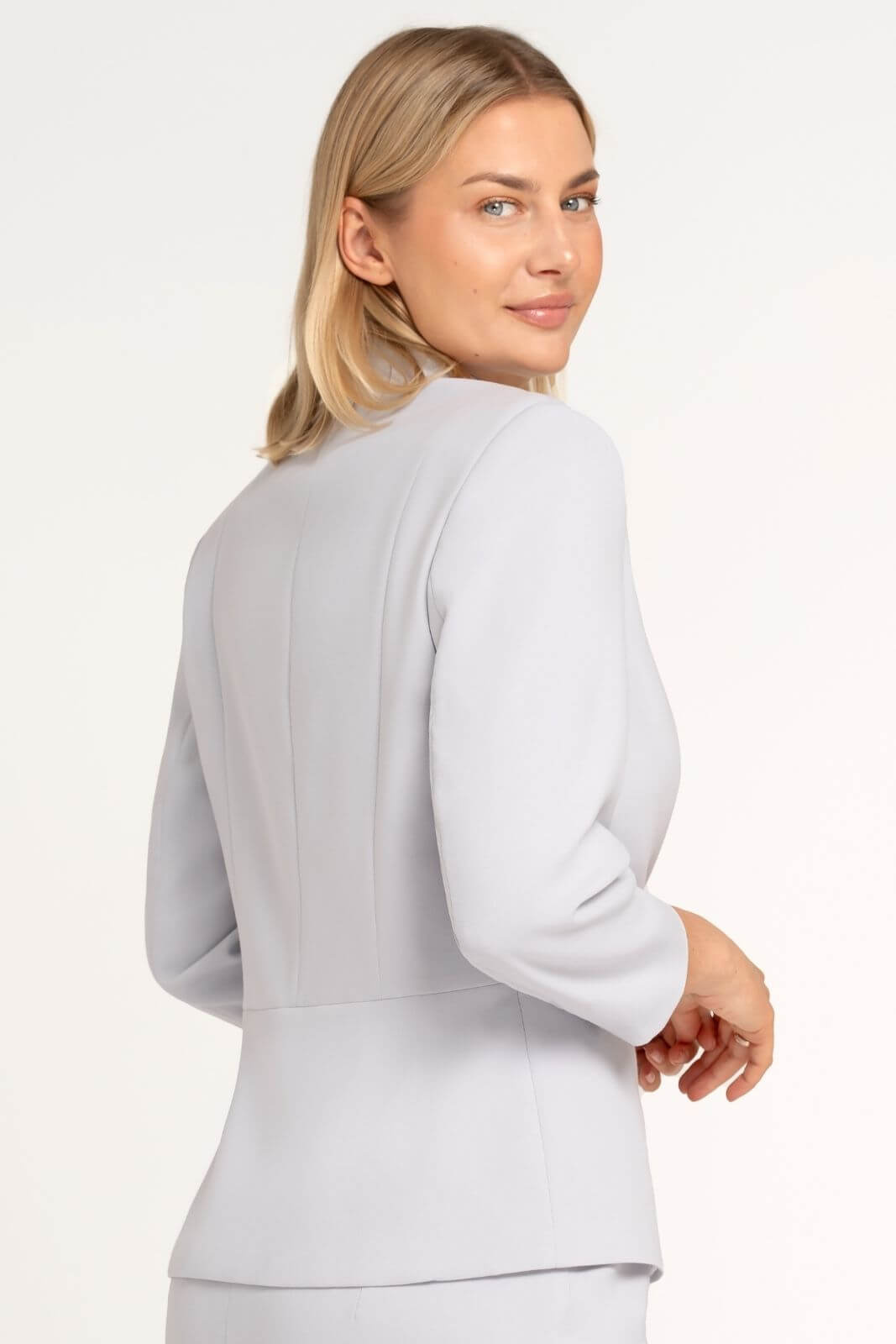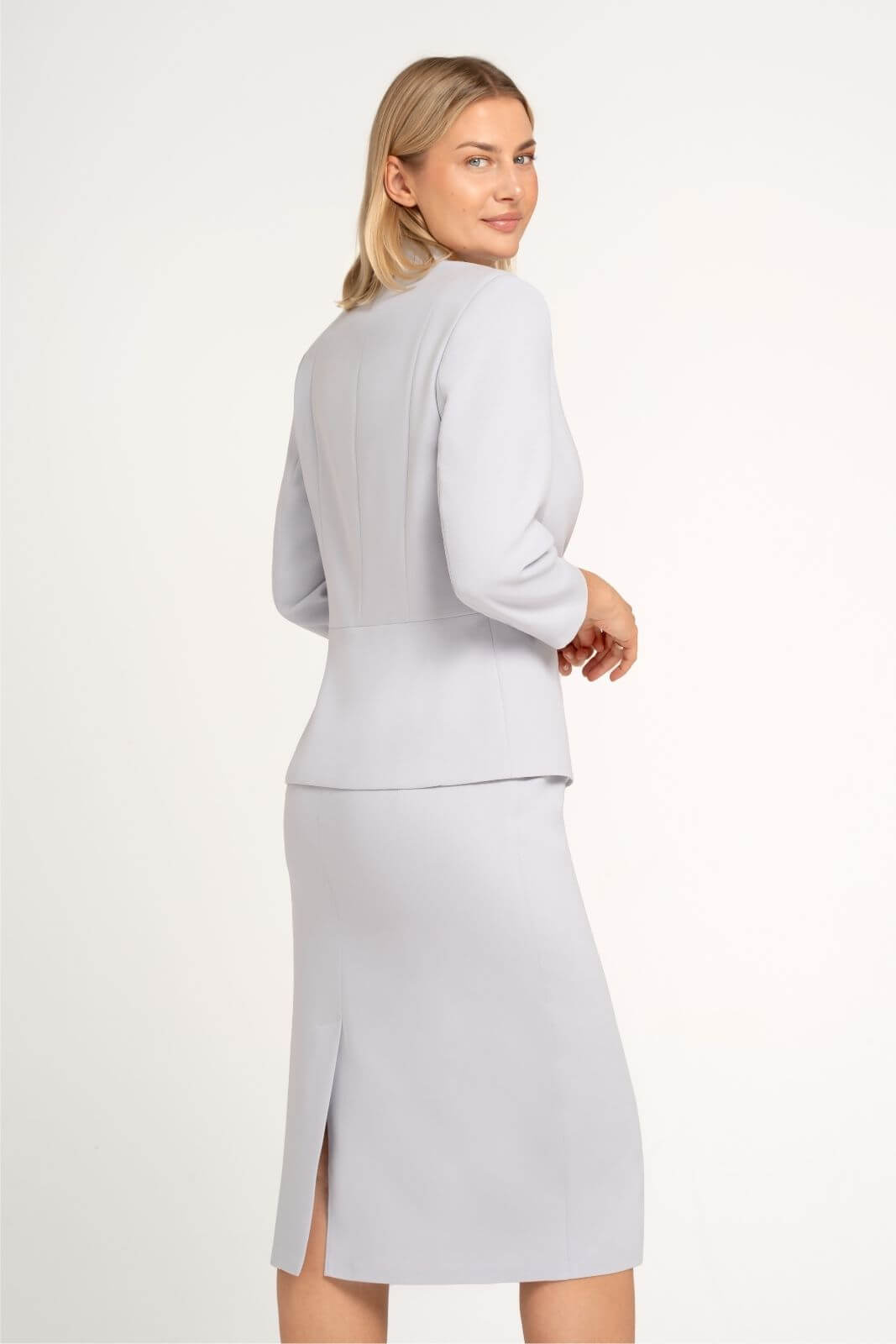 Das Damenkostüm Adele in Hellgrau ist ein Klassiker, der sich sowohl mit einfarbigen, dezenten Tönen als auch mit auffälligen Mustern kombinieren lässt. Eine ideale Wahl für offizielle Anlässe und elegante Empfänge – ein unverzichtbares Teil Ihrer Garderobe.