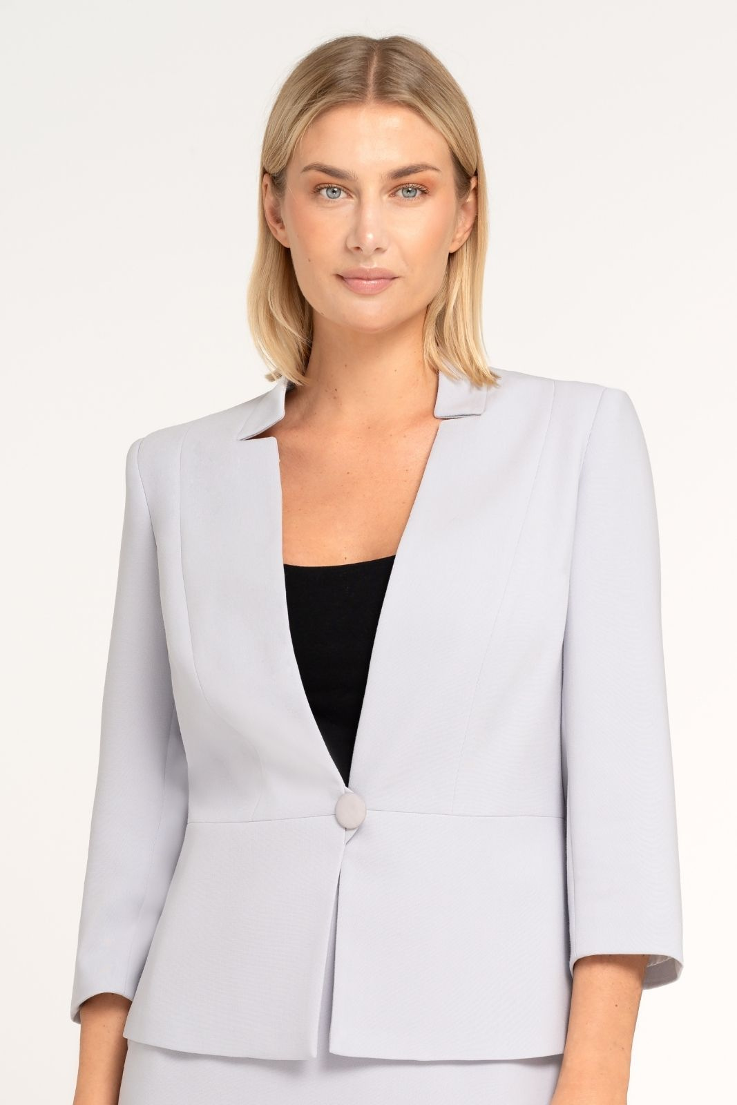 Das Bolero Adele in Hellgrau ist aus einem hochwertigen, matten Stoff gefertigt, der angenehm weich ist und knitterfrei bleibt. Der elegante Schnitt mit Stehkragen und dezentem Ausschnitt betont die Halspartie und verleiht der gesamten Garderobe eine besondere Note. Die taillierte Passform und die vertikalen Teilungsnähte strecken optisch die Figur. Der elegante Knopfverschluss unterstreicht den festlichen Charakter des Boleros.