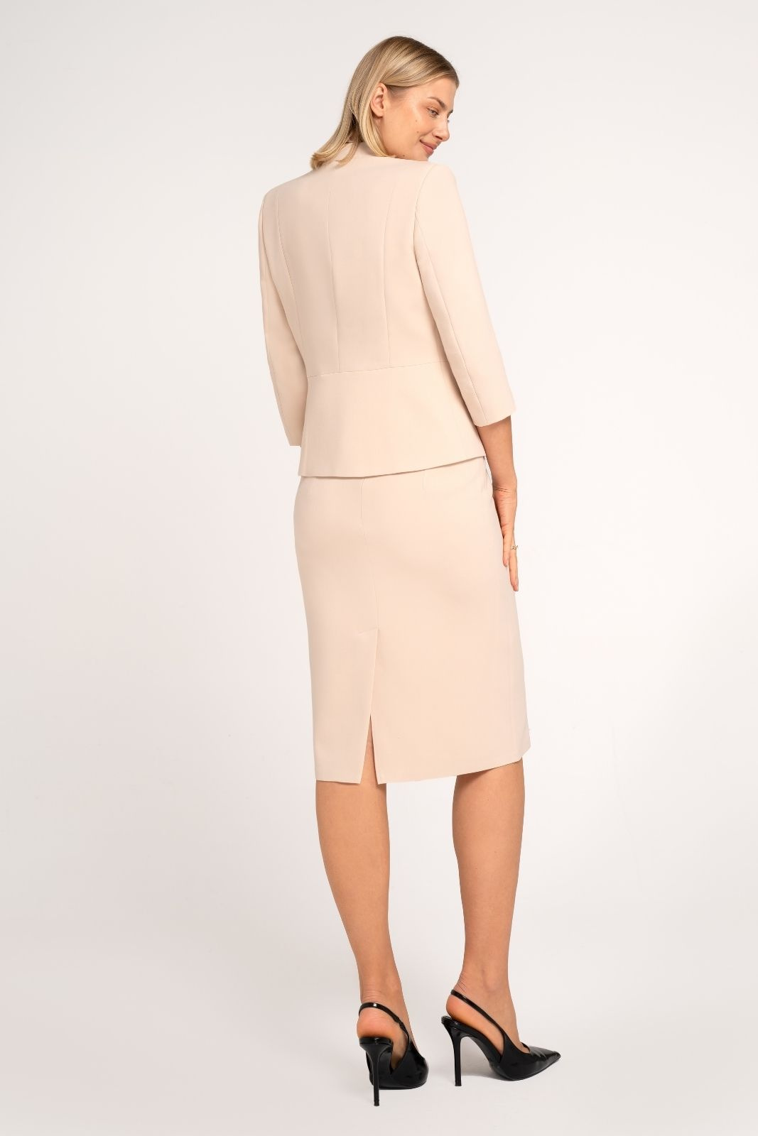 Das elegante Damenkostüm Adele in Beige ist die perfekte Wahl für Frauen, die klassischen Stil und Komfort schätzen. Es besteht aus einem stilvollen Bolero mit Stehkragen und einem figurbetonten Bleistiftrock, die zusammen einen harmonischen und eleganten Look für verschiedene Anlässe schaffen: Familienfeiern, Kommunionen, Taufen oder festliche Empfänge.